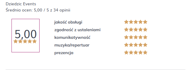 DOSKONAŁA Na podstawie 2 opinii Opublikowano na Dorota Osmola-TuczyńskaTrustindex sprawdza, czy pierwotnym źródłem recenzji jest Google. Impreza weselna, z której nie chciało się wychodzić. Podkręciłeś nasze emocje, naszą radość, nasze „tu i teraz”. Czuć było, że grasz dla ludzi – i z ludźmi. Nie było zwyczajnej muzyki, było życie! Grasz z sercem i totalnym wyczuciem – parkiet był pełny do samego końca, a nasze ulubione kawałki wybrzmiały jak hymn tej nocy. Dziękujemy za ciężki dym, który w otwartym terenie zaistniał. Dziękujemy za radość, luz i idealny klimat!Opublikowano na MagdalenaTrustindex sprawdza, czy pierwotnym źródłem recenzji jest Google. Z całego serca chcemy Wam podziękować za stworzenie niesamowitej atmosfery na naszym weselu! Dzięki Wam ten dzień stał się niezapomnianą, pełną energii i radości zabawą, którą będziemy wspominać przez długie lata. Wasza muzyka idealnie odzwierciedlała nasz gust, a także świetnie wprowadziła wszystkich w doskonały nastrój. Jesteście prawdziwymi mistrzami w tym, co robicie – potrafiliście połączyć różnorodne style, zadbać o każdy szczegół i sprawić, że parkiet nigdy nie świecił pustkami. Wasza energia, profesjonalizm i uśmiech sprawiły, że cała zabawa była tak wyjątkowa, a goście nie mogli przestać tańczyć :)Potwierdzono przez: TrustindexZweryfikowana odznaka Trustindex to Uniwersalny Symbol Zaufania. Tylko najlepsze firmy mogą uzyskać zweryfikowaną odznakę z oceną powyżej 4.5, na podstawie opinii klientów z ostatnich 12 miesięcy. Przeczytaj więcej